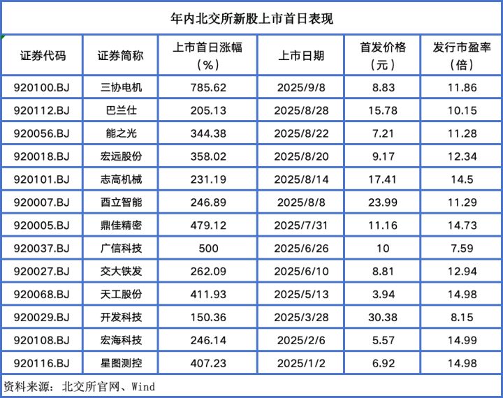 整体来看,截至目前,北交所年内共迎来13只新股,首日最低涨幅约150%,其余12只新股首日涨幅均在200%以上,逾半数新股(7只)首日涨幅超300%。